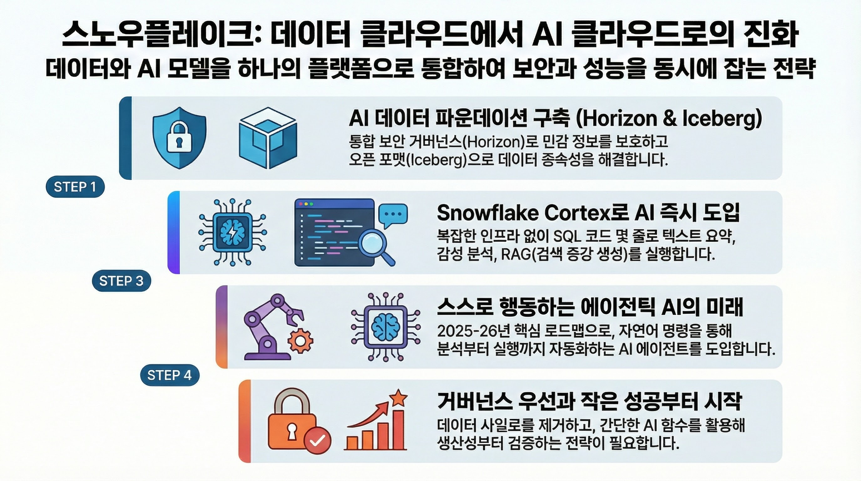 스노우플레이크의 로드맵은 결국 **"데이터가 있는 곳으로 AI가 직접 찾아가는 구조"**를 만드는 것입니다. 데이터를 밖으로 옮길 필요가 없으므로 보안과 성능 두 마리 토끼를 모두 잡을 수 있는 것이 가장 큰 강점입니다.