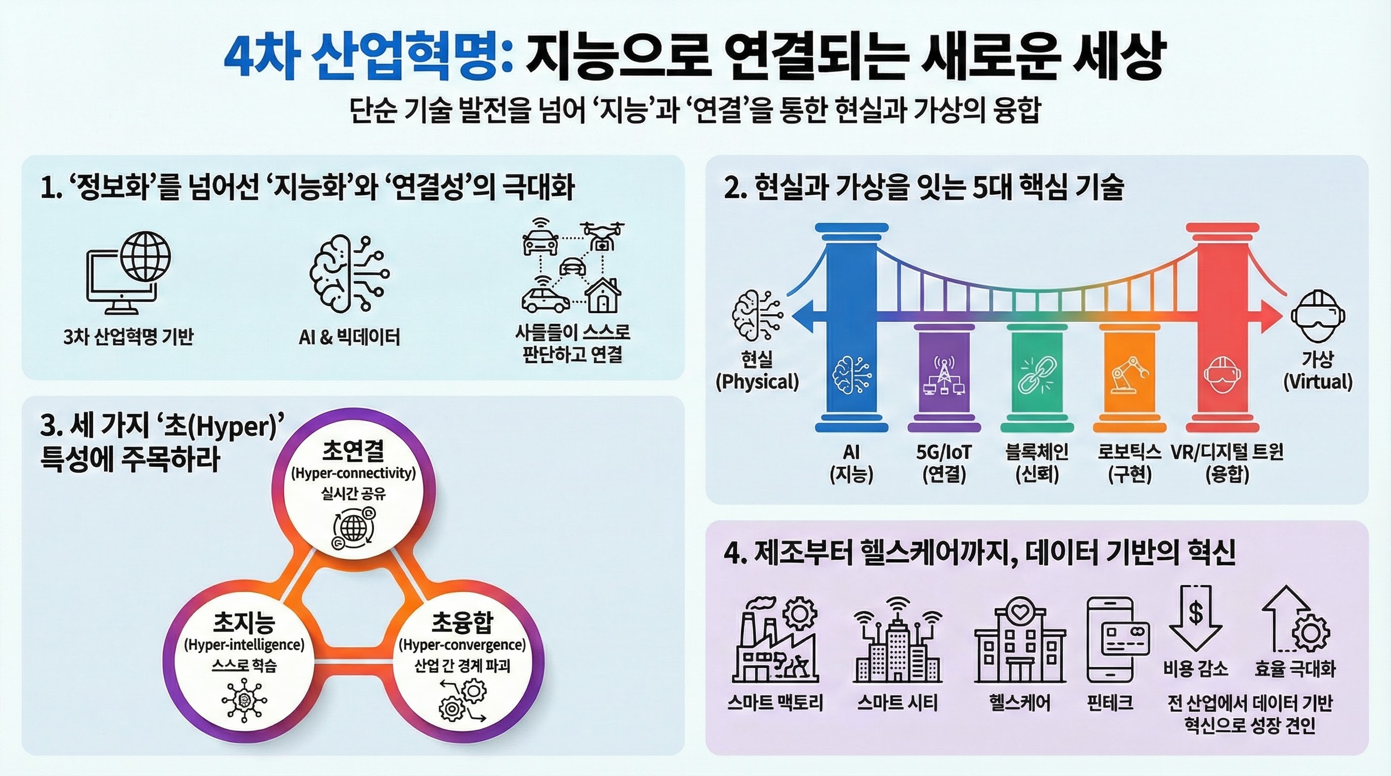 - 초지능성 (Hyper-intelligence): AI가 방대한 데이터를 스스로 학습하고 인간의 지적 능력을 넘어서는 판단을 내립니다.
