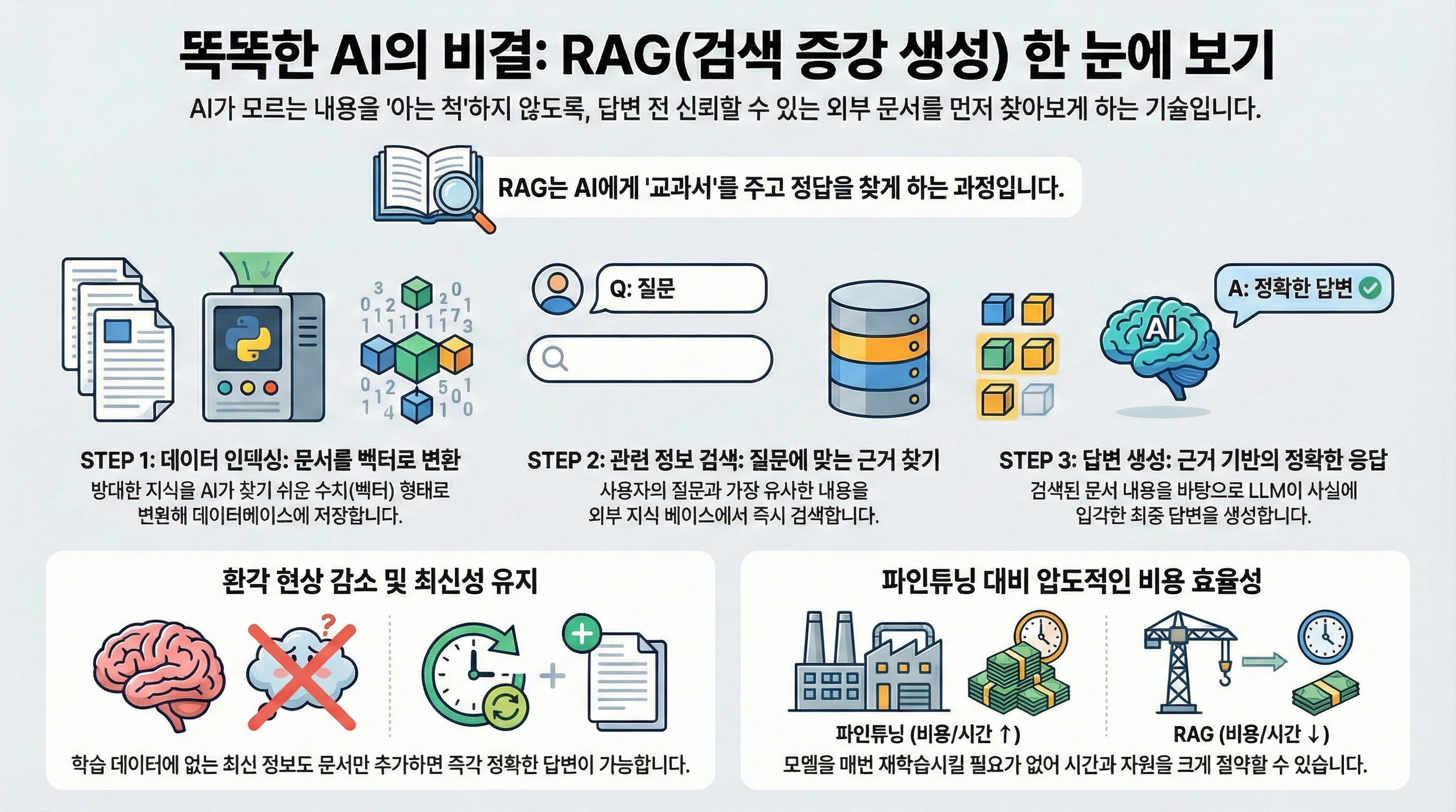 LLM은 학습된 시점 이후의 정보를 알지 못하거나(지식의 컷오프), 사실이 아닌 정보를 그럴듯하게 말하는 환각(Hallucination) 현상이 발생할 수 있습니다. RAG는 모델이 질문에 답하기 전 관련 문서를 먼저 "찾아보고(Retrieval)", 그 내용을 바탕으로 답변을 "생성(Generation)"하게 함으로써 이 문제를 해결합니다.