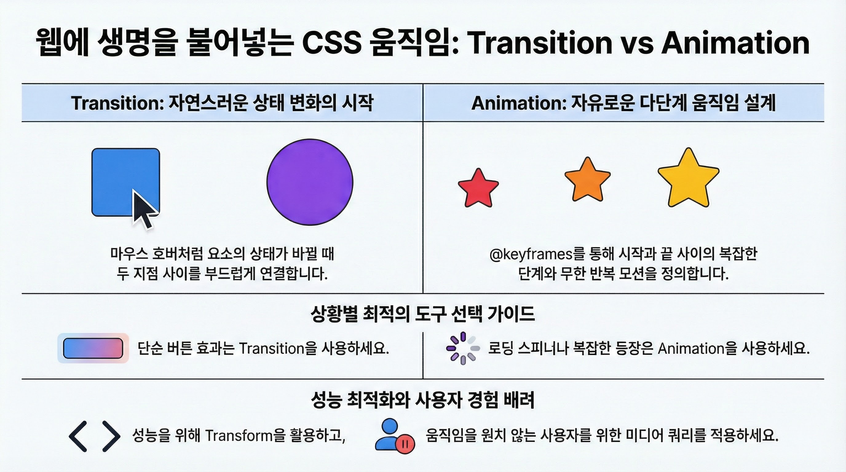 웹 디자인에서 '움직임'은 단순히 눈을 즐겁게 하는 요소가 아닙니다. 사용자의 시선을 유도하고, 인터랙션에 대한 피드백을 제공하며, 브랜드의 성격을 드러내는 중요한 도구입니다. 오늘은 CSS의 핵심 기능인 Transition과 Animation을 활용해 정적인 페이지에 생명력을 불어넣는 방법을 알아보겠습니다.