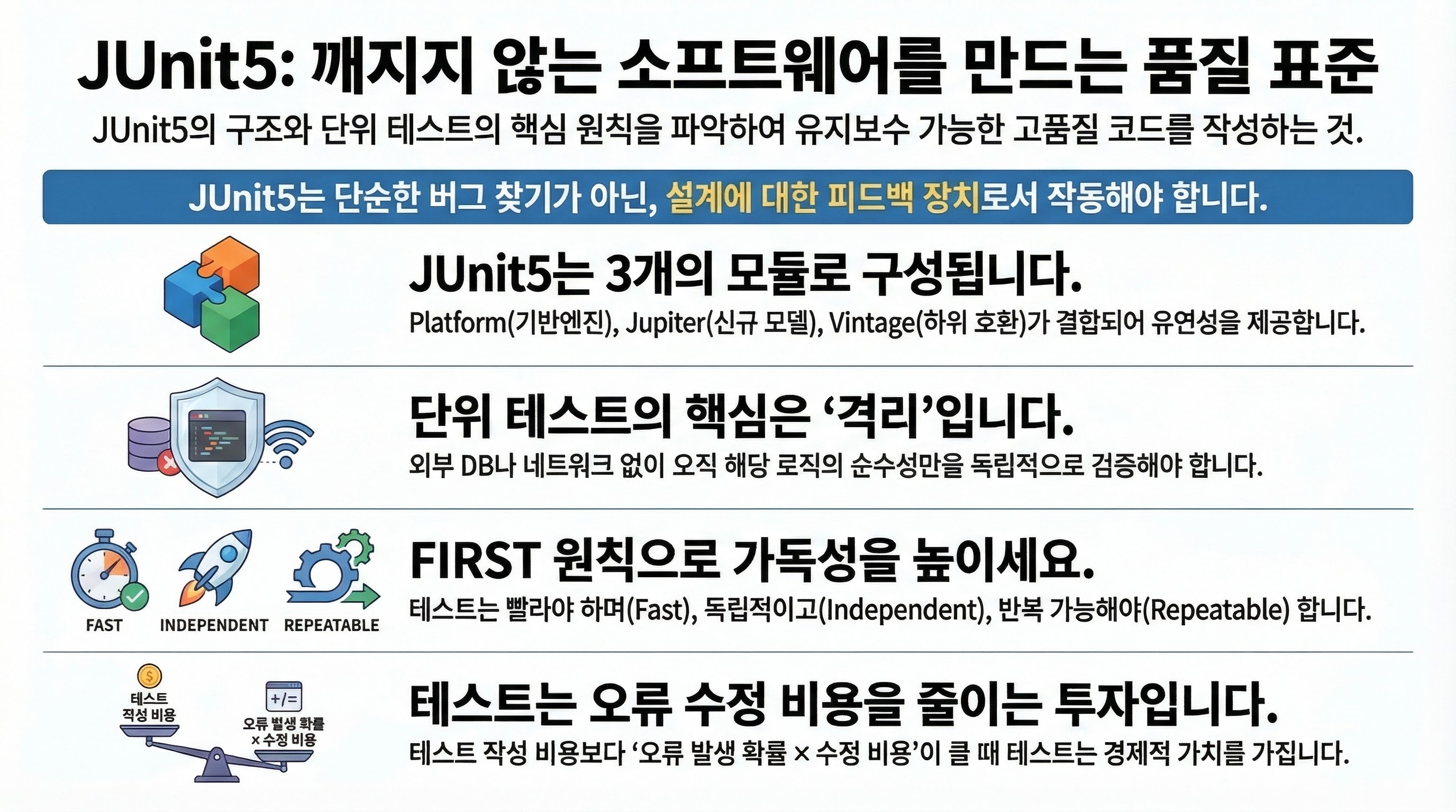 JUnit5를 활용한 단위 테스트는 단순히 '버그를 찾는 작업'이 아니라, **'내가 짠 코드에 대한 품질 보증서'**를 발행하는 과정입니다. 좋은 테스트 코드는 그 자체로 훌륭한 API 문서가 되며, 동료 개발자들에게 여러분의 코드 의도를 명확히 전달합니다.