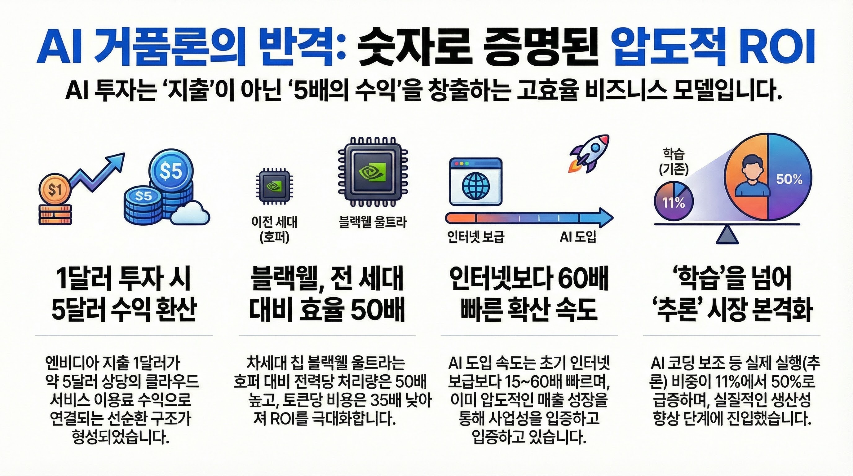 그의 메시지는 명확합니다. 현재의 국면은 실체가 없는 거품이 아니라, 컴퓨팅 패러다임이 전환되는 과정에서 발생하는 구조적 재편이라는 것입니다. 젠슨 황은 데이터와 기술적 지표를 근거로 **"AI 거품론은 시기상조"**임을 천명하며, 시장의 불안을 기술적 확신으로 되받아치고 있습니다.