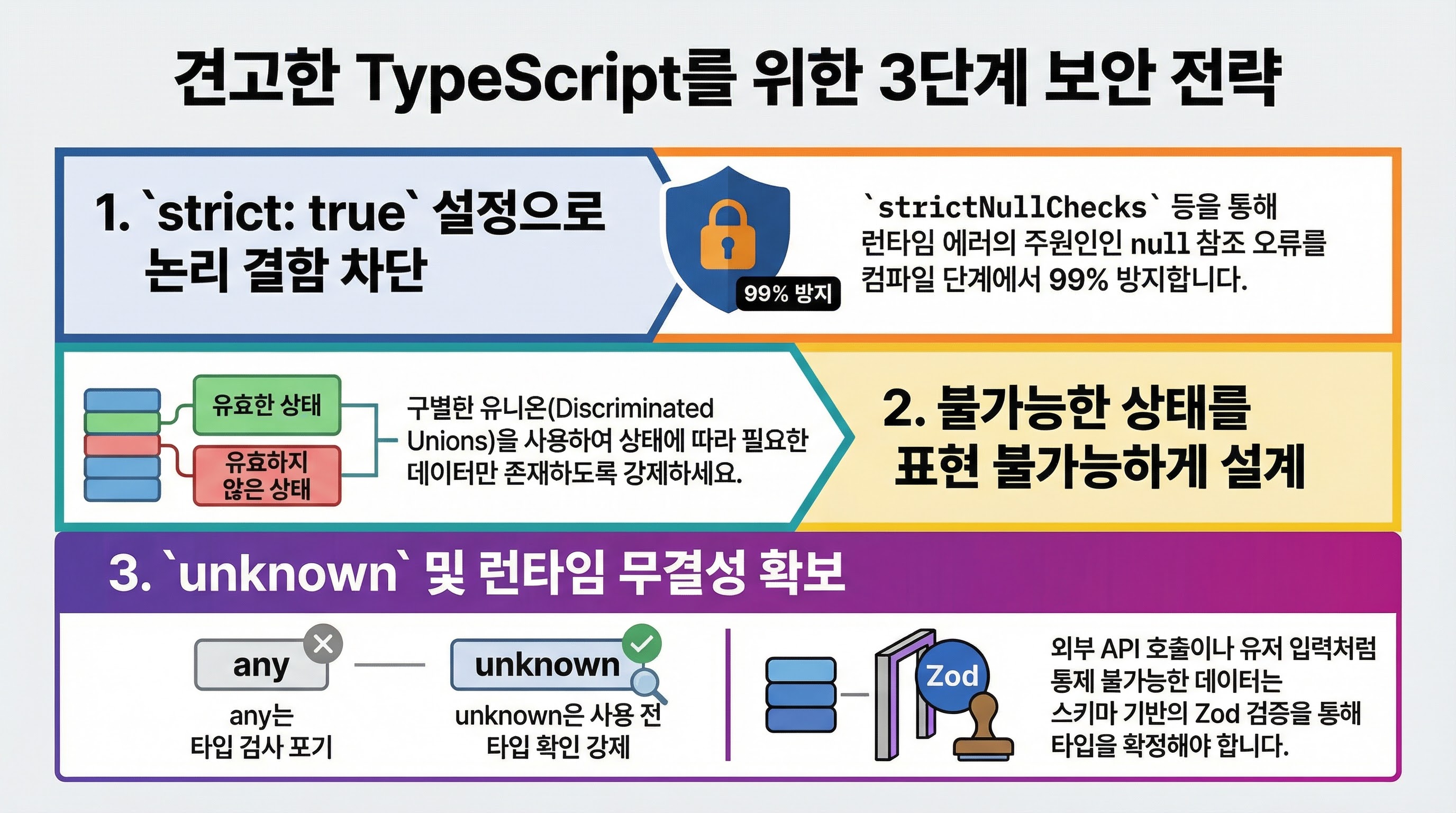TypeScript를 사용하는 궁극적인 목적은 에러를 사전에 방지하고 안전한 코드를 작성하는 것입니다. 이를 위해 가장 먼저 선행되어야 할 것은 **컴파일러의 엄격한 검사(strict: true)**이며, 그 다음은 도메인을 정확하게 반영하는 타입 설계 철학, 마지막으로 **런타임 데이터의 무결성(Zod)**을 확보하는 것입니다.